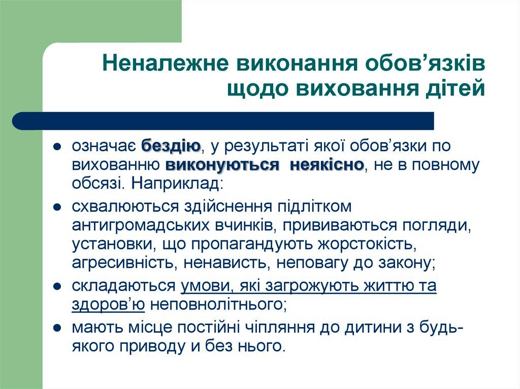 За невиконання або неналежне виконання обов’язків щодо виховання дітей батьки можуть бути притягнені до різних видів юридичної відповідальності: адміністративної, кримінальної, сімейно –правової.