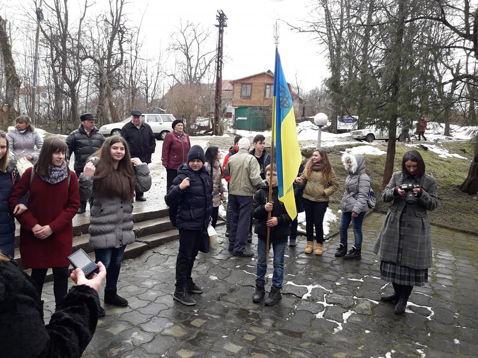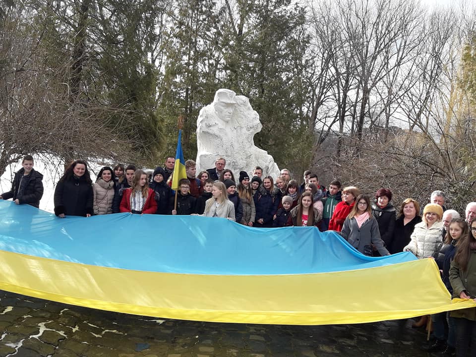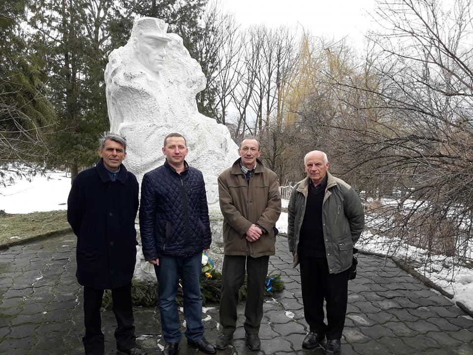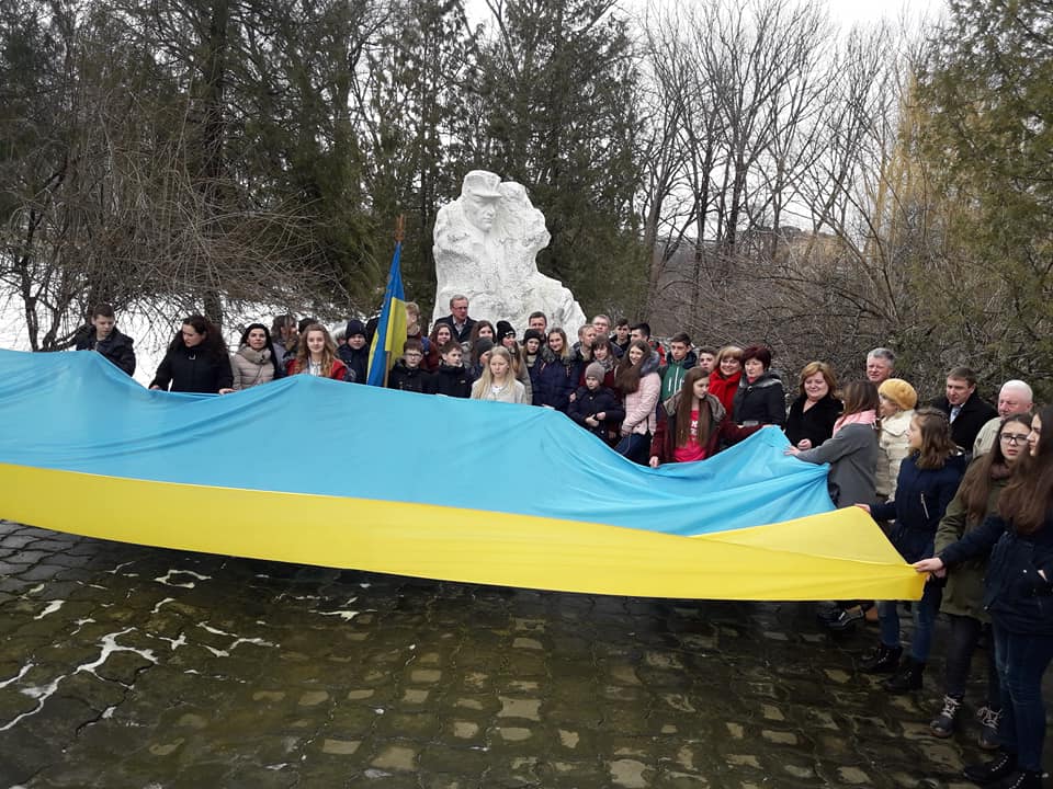 З національним жовто-синім знаменом, зеленим вінком та кошиками квітів колона пройшла від музею історії міста до родинного обійстя Різняків, де зараз знаходиться пам’ятник нашому землякові. Нагадаємо, що цей пам’ятник був виготовлений скульптором Володимиром Ропецьким у 1995 році. Біля пам’ятника присутні поклали квіти та виконали Державний гімн України.