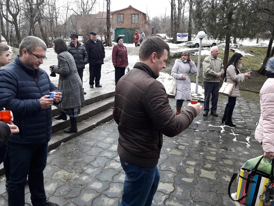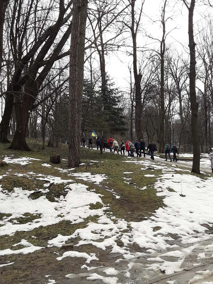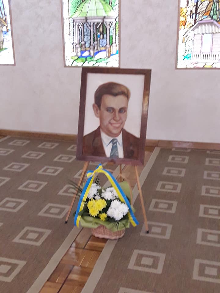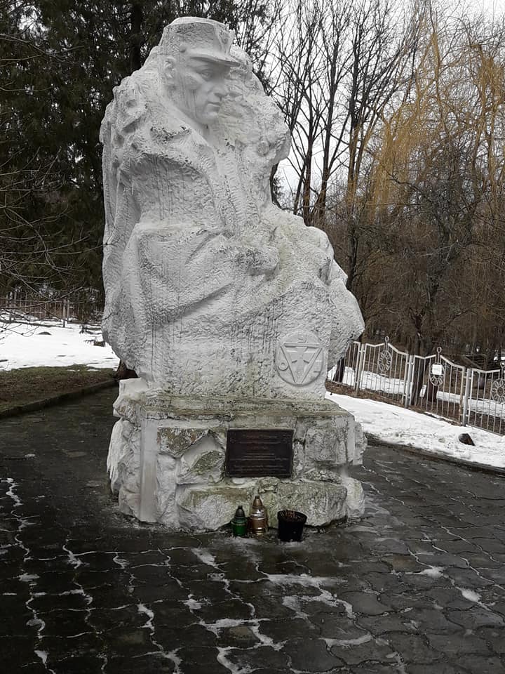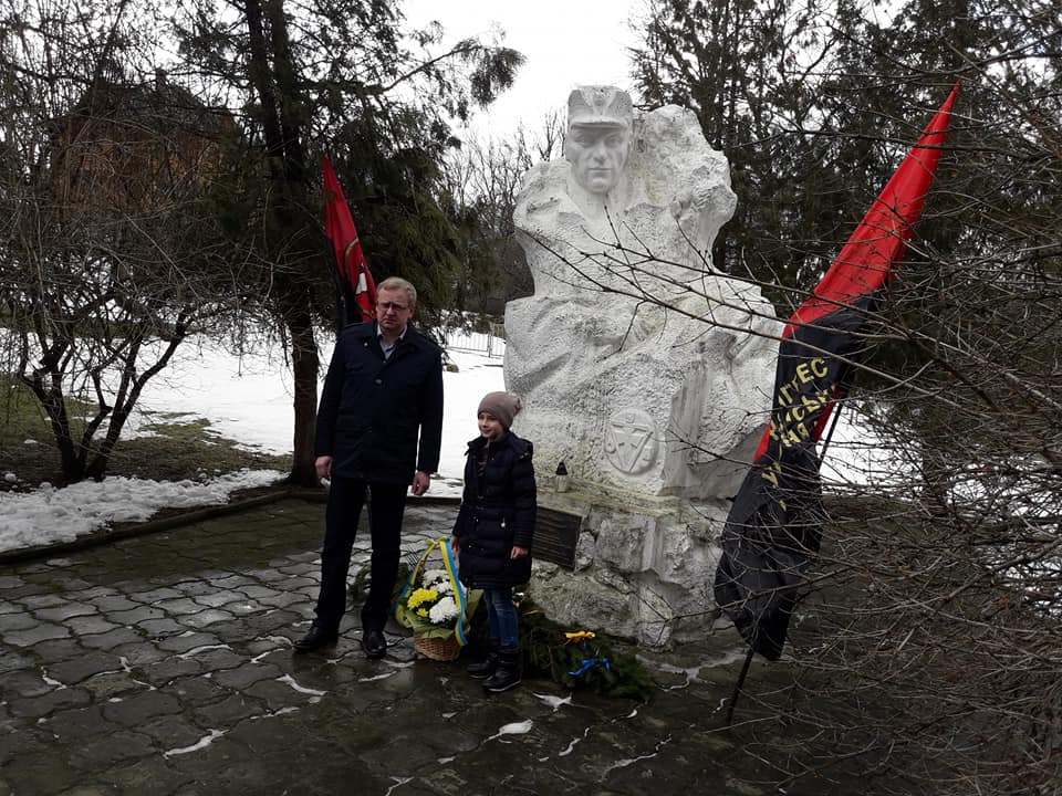 З національним жовто-синім знаменом, зеленим вінком та кошиками квітів колона пройшла від музею історії міста до родинного обійстя Різняків, де зараз знаходиться пам’ятник нашому землякові. Нагадаємо, що цей пам’ятник був виготовлений скульптором Володимиром Ропецьким у 1995 році. Біля пам’ятника присутні поклали квіти та виконали Державний гімн України.