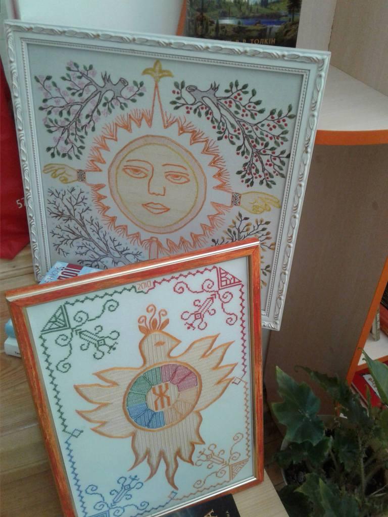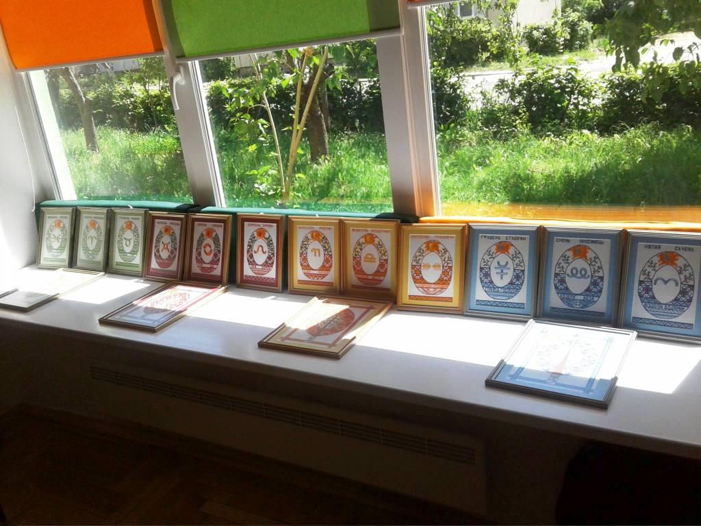 На зустріч пані Галина привезла частину своєї колекції «Український рік». Це не просто вишивки. Кожен місяць та пора року зображені закодованими символами. Квадрат – це символ порядку, овал – гармонія, і вишня у формі писанки-яйця. У всіх роботах присутня вишня, бо, як пояснює пані Галина, вишня, всевишній, вишивка мають однаковий корінь. А оскільки вишивка це давнє праписьмо, його треба писати правильно, використовуючи правильно не лише знаки, символи, але давні техніки – затягана, стеблівка.