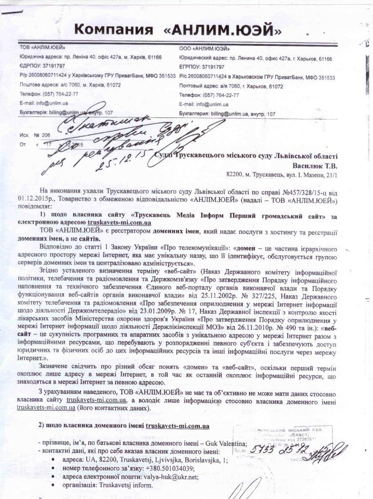 Чергове слухання справи проходило у Трускавецькому суді в понеділок, 8 лютого. На виконання ухвали суду про забезпечення доказів та з метою встановлення власників сайту truskavets-mi.com.ua компанія «Анлим.Юэй», зареєстрована в Харкові, надіслала відповідь, в якій йдеться про те, що адреса власника доменного імені – 82200, Львівська обл., м. Трускавець, вул. Бориславська, 1. Як знаємо, за цією адресою знаходиться адміністративний корпус №2 Трускавецької міської ради.