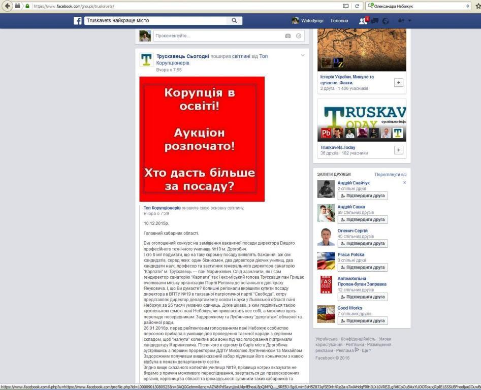 «Головний хабарник області. Був оголошений конкурс на заміщення вакантної посади директора Вищого професійного технічного училища №19 м. Дрогобич. І хто б міг подумати, що на таку скромну посаду виявлять бажання, аж сім кандидатів, серед яких: один бізнесмен, два директори діючих училищ, два кандидати наук, професор та заступник генерального директора санаторію “Карпати” м. Трускавець — пан Маринкевич. Слід зазначити, як і сам гендиректор санаторію “Карпати” так і екс-міський голова Трускавця пан Грицак очолювали міську організацію Партії Регіонів до останнього дня краху Януковича. І, що Ви думаєте? Колишні регіонали вирішили купити посаду директора в ВПТУ №19 в так званої патріотичної партії “Свобода”, котру представляє директор департаменту освіти і науки у Львівській області пані Небожук за 25 тисяч умовних одиниць. Дуже цікаво, з ким поділиться такою кругленькою сумою пані Небожук, чи привласнить все собі, а можливо щось перепаде посередникам: Задорожному та Лук’янченку “депутатам” обласної та районної ради. 26.01.2016 р. перед рейтинговим голосуванням пані Небожук особистою персоною приїхала в училище для проведення таємної наради з керівним складом, щоб “нагнути” колектив аби вони під час голосування підтримали кандидатуру Маринкевича. Після чого в одному із барів міста Дрогобича зустрівшись з першим проректором ДДПУ Миколою Лук’янченком та Михайлом Задорожним получивши вищевказаний хабар підливши його коньячком з кавою відбула в пенати департаменту освіти. Згідно вище сказаного колектив училища №19, прізвища котрих вказувати не будемо з причин можливого переслідування, звертається до правоохоронних органів, керівництва області та громадськості зупинити таких хабарників та розслідувати дану справу, щодо пані Небожук і посередників-хабародавців, прийняти самі суворі міри покарання за використання службового становища. 02.02.2016 р. Колектив ВПТУ №19»