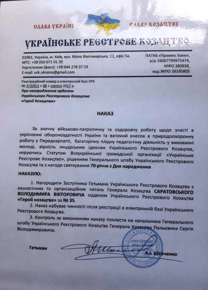 Трускавчанин Володимир Вікторович Саратовський нагороджений орденом Українського Реєстрового Козацтва «Герой козацтва». Відповідний наказ був підписаний Гетьманом УРК Анатолієм Шевченком. Високу нагороду наш земляк, член Президії МГО «Рада Старійшин» м. Трускавця отримав за значну військово-патріотичну та оздоровчу роботу щодо участі в укріпленні обороноздатності України, вагомий внесок у природоохоронну роботу, вірність лицарським ідеалам Українського Реєстрового Козацтва.