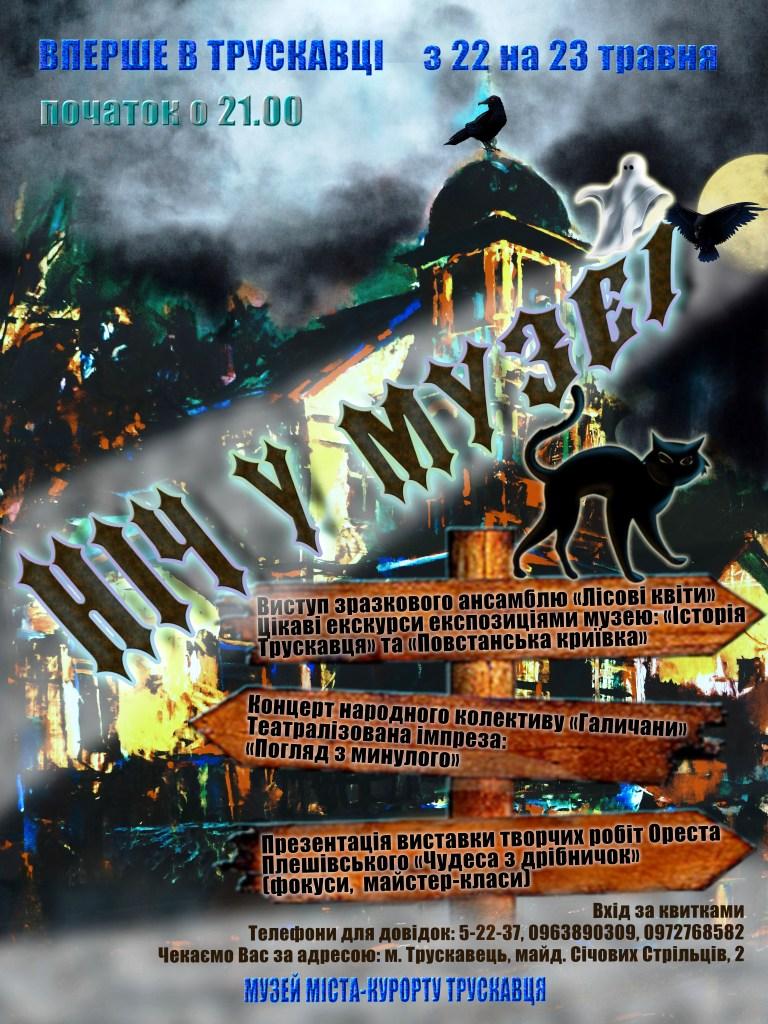 В ніч з 22 на 23 травня 2015 р. (з п’ятниці на суботу) о 21.00 год. у трускавецькому музеї історії міста-курорту розпочнеться дійство «Ніч у музеї». Такий захід відбуватиметься у Трускавці вперше.
