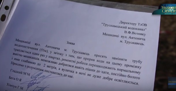 Ні заяви до керівництва “Трускавецького водоканалу”, ні звернення до газової служби ніякого позитивного результату поки не дають. “Водоканал” виявився настільки бідним, що не в змозі замінити стометрову ділянку трубопроводу, на якій стаються постійні прориви. А газова служба, в особі Миколи Шандровського, віднікується від відповідальності та вважає, що все з їхньої сторони було зроблено правильно. І байдуже, що газова труба вже декілька разів пробита через відсутність захисного короба.