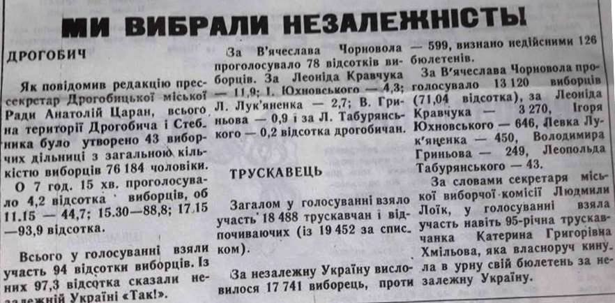 Для порівняння, в Дрогобичі та Стебнику, де на 01.12.1991 було 76 184 виборці, за Чорновола віддало свій голос 78%, за Кравчука 11,9%, за Юхновського 4,3%, за Лук`яненка 2,7%, за Гриньова 0,9%, за Табурянського 0,2%.