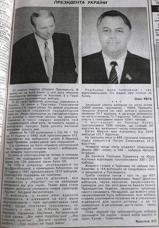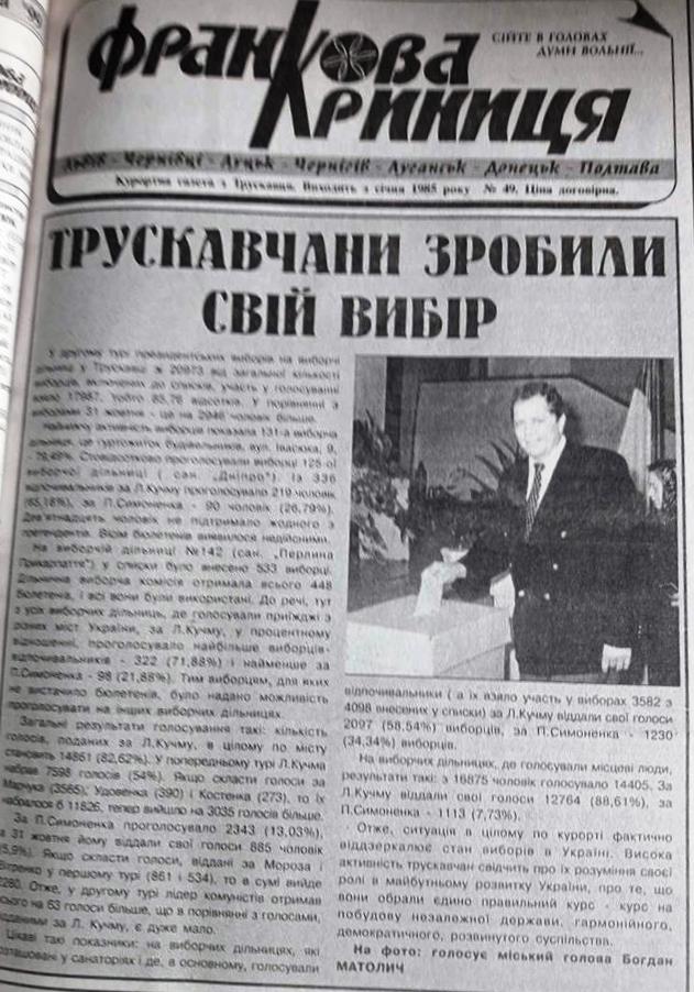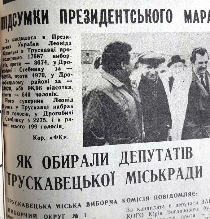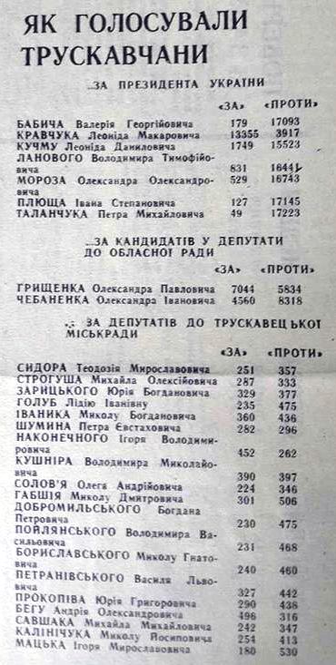 Правда, через тиждень появилися уточнені дані: за Кравчука у Трускавці проголосувало 17 687 виборців, а за Кучму 2 519. У Дрогобичі і Стебнику Кравчук набрав 64 958 голосів, а Кучма 2 275. В Дрогобицькому районі за Кравчука проголосувало 53 920 осіб (98,96%), а за Кучму лише 199 виборців.