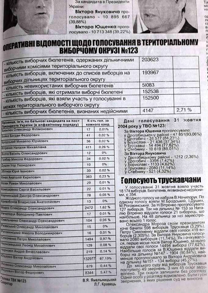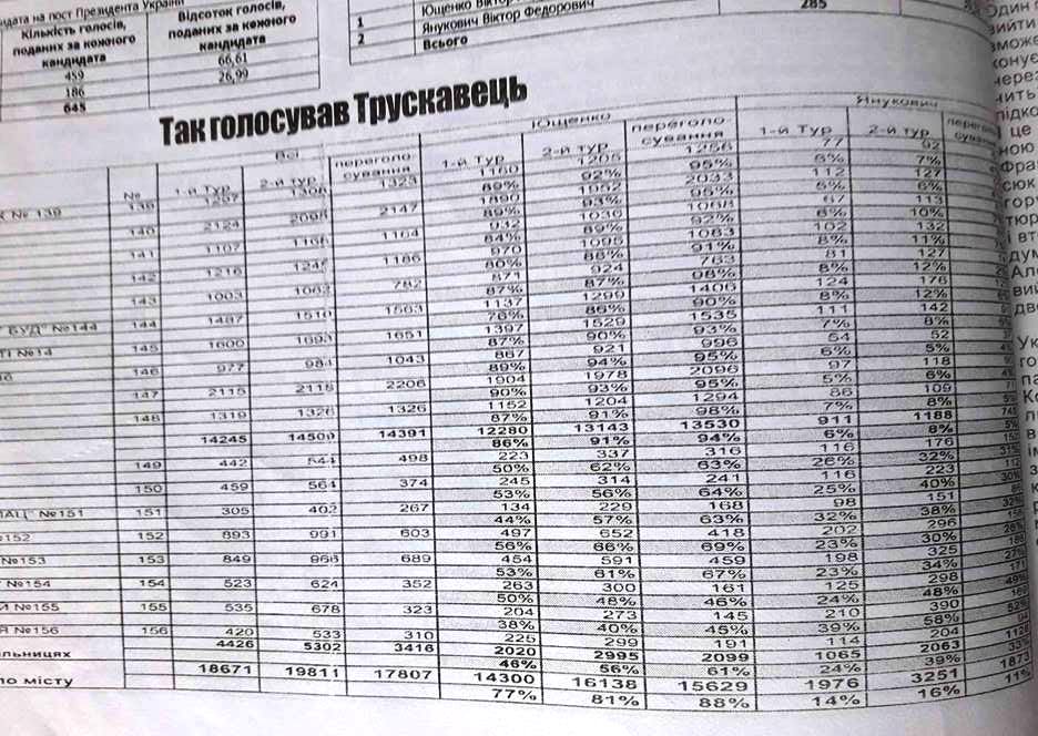 31 жовтня 2004 року в першому турі президентських виборів у Трускавці за Віктора Ющенка проголосувало 14 494 виборці (77,62%), за Віктора Януковича 2 080 (11,14%). Тоді участь в голосуванні взяло 18 174 виборці, 354 бюлетені визнано недійсними. В другому турі 21 листопада за Ющенка віддало свій голос 16 138 виборців Трускавця (81%), за Януковича – 3 251 (16%). А потім була Помаранчева революція і третій тур, як інакше називали переголосування другого туру. В ньому Ющенка підтримало 15 629 трускавчан (88%), а Януковича 1 873 (11%). Нагадаємо, що в третьому турі вже не було відкріпних талонів і «каруселів». Як бачимо, у проросійських сил у Трускавці завжди була стабільна підтримка близько 10% виборців.