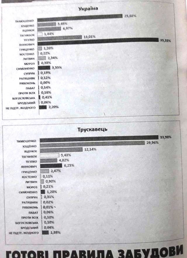Проте між першим і другим туром сталося непередбачуване. Проти Тимошенко почали вести агітацію не так прихильники Януковича, яких фактично у Трускавці була мізерія, і не комуністи. Найбільше бризкали жовчю і люттю проти Юлії Тимошенко «ющенківці». Їхні прізвища відомі, вони й зараз намагаються себе видати за «громадських активістів», а в 2010-2015 роках навіть мали у Трускавці всю повноту влади. Як результат – у другому турі 2010 року Янукович отримав у Трускавці знову кожен десятий голос (детальніші дані – за посиланням https://truskavetskyjvisnyk.io.ua/s200509/truskaveckiy_visnik_12_135_vid_8_lyutogo_2010_r).