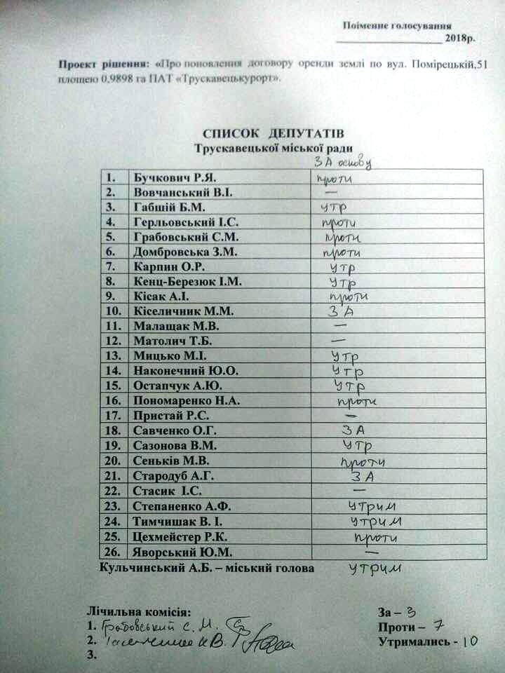 25 січня сталася важлива подія в історії Трускавця. На XXXVII сесії Трускавецької міської ради VII демократичного скликання депутати не продовжили оренду двох земельних ділянок для ПрАТ «Трускавецькурорт». Мова йде про земельні ділянки біля колишнього приміщення ГГРЕС при дорозі на Помярки (вул. Помірецька, 51, площа земельної ділянки 0,9898 га, кадастровий номер 4611500000:11:010:0021) для обслуговування лабораторно-адміністративного корпусу, та про ще одну ділянку по вул. Роксолани, 10. При розгляді першого питання про оренду землі для ПрАТ «Трускавецькурорт» «за» було подано тільки три голоси (депутати Кіселичник, Савченко, Стародуб), а при розгляді другого питання – жодного голосу «за». Це свідчить, що під тиском громадськості приходить усвідомлення того факту, що з ворогом співпрацювати не можна. Бо ПрАТ «Трускавецькурорт» явно не належить до «стратегічних партнерів», як це дехто хотів би подати. І саме так, крок за кроком, потрібно очищувати місто від цієї структури, не даючи їй жодного шансу. Втім, так само потрібно діяти і з іншими московськими засланцями, які є не менш небезпечними для Трускавця, аніж ПрАТ, оскільки вводять в оману людей, прикриваючись псевдопатріотичними гаслами та займаючись демагогією.