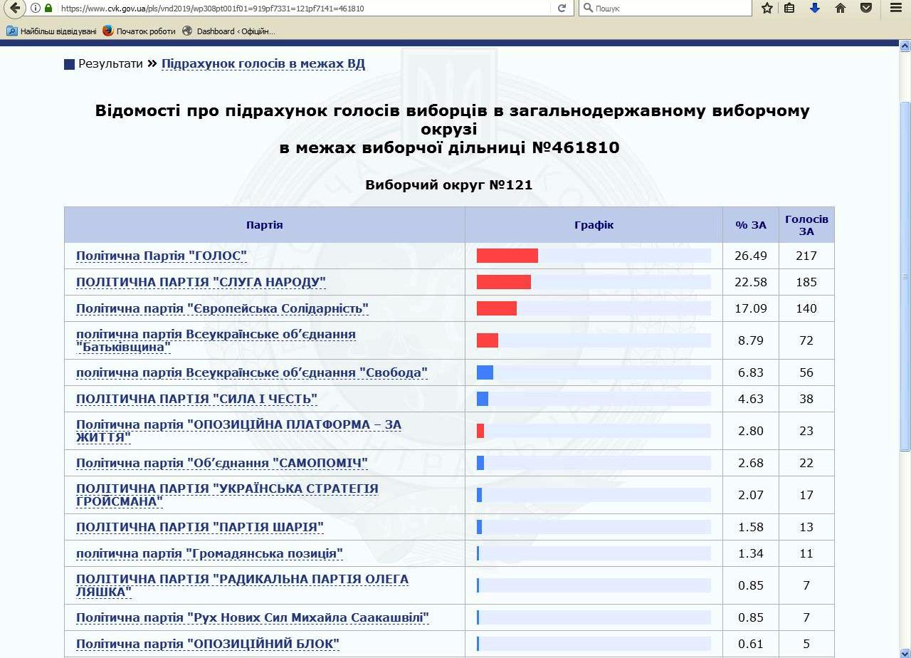 За партії на цій дільниці проголосували так: «Слуга народу» – 294 (25,65%), «Голос» – 279 (24,34%), «ЄС» – 202 (17,62%), «Батьківщина» – 113 (9,86%), «Свобода» – 72 (6,28%). Шостою йде «Громадянська позиція» (72 голоси, 6,28%), далі «Сила і честь».
