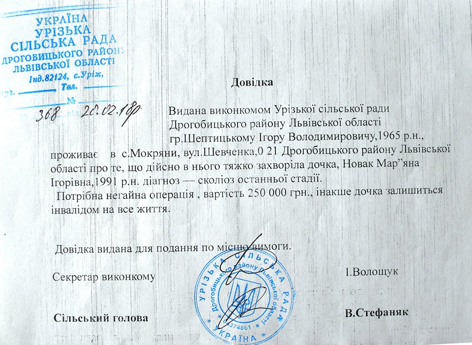 Батьки за своїх дітей ладні стрибнути у вогонь чи воду. Так робить і мешканець села Мокряни Дрогобицького району Ігор Шептицький. Батькове серце щемить, коли дивиться, як страждає його донька Мар’яна Новак: нестерпний головний біль, важкість пересування. Мар’яна – інвалід з дитинства, діагноз – сколіоз грудно-поперекового відділу четвертої стадії.