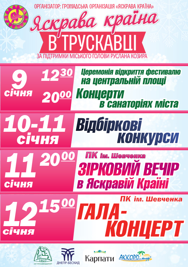 З 8 по 13 січня у Трускавці за підтримки Трускавецької міської ради та партнерів фестивалю: готельно-курортного комплексу “Карпати”, ЗАТ «Трускавецькурорт», санаторно-готельного комплексу «Дніпро-Бескид», туристичної компанії «Акорд – Тур», традиційно відбудеться VI Всеукраїнський фестиваль-конкурс дитячої та юнацької творчості «ЯСКРАВА КРАЇНА» В ТРУСКАВЦІ – 2015». Організатором фестивалю виступає громадська організація «Яскрава Країна». Мета фестивалю: розвиток дитячого хореографічного і вокального мистецтва, обмін досвідом, розвиток і зміцнення творчих зв’язків, знайомство з історичною та культурною спадщиною Львівщини.