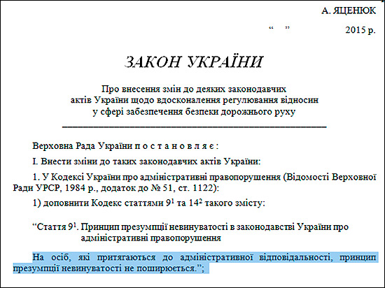 Прем’єр-міністр України Арсеній Яценюк зареєстрував у Верховній раді законопроект, який суттєво змінює принцип накладення адміністративних стягнень. Так, згідно проекту закону №2562 від 06.04.2015 року, для осіб, які залучаються до адмін-відповідальності, скасовується презумпція невинності! Таким чином, за всіма статтями КУпАП громадянин сам повинен доводити свою невинність.