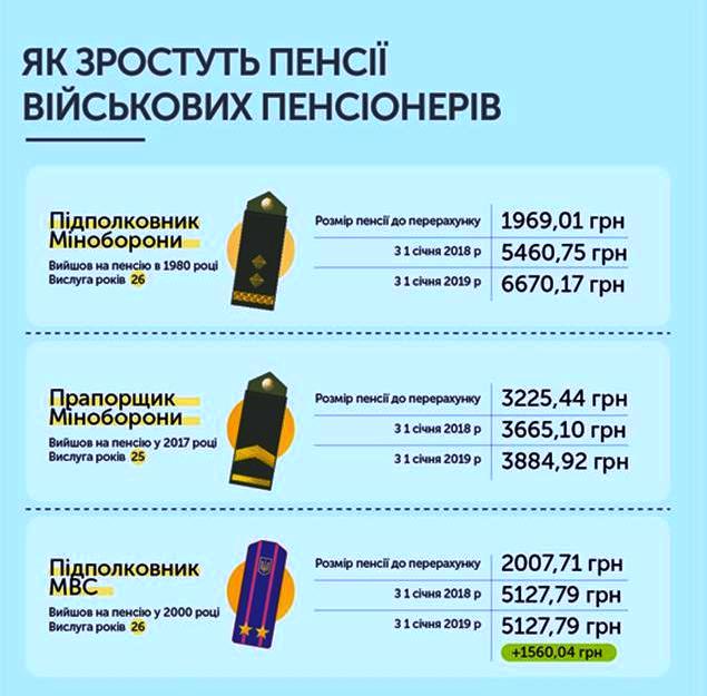 Довідка: 1 березня 2018 року введено в дію постанову Кабінету Міністрів України № 704 «Про грошове забезпечення військовослужбовців, осіб рядового і начальницького складу та деяких інших осіб» (зі змінами). Документ розроблений Міністерством соціальної політики на виконання доручення Прем’єр-міністра України Володимира Гройсмана. Постанова передбачає поетапне підвищення пенсій представникам силових органів починаючи з 1 січня 2018 року. Процедура перегляду пенсій розпочалась 1 березня 2018 року. Загалом, за два роки військові пенсії мають подвоїтись. До перерахунку середня пенсія військових складала 2898,41 грн.