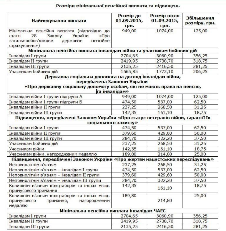 Законом України від 17.09.2015 № 704-VIII «Про внесення змін до Закону України «Про Державний бюджет України на 2015 рік» передбачено збільшення з 1 вересня розміру прожиткового мінімуму для осіб, які втратили працездатність, до 1074 грн.