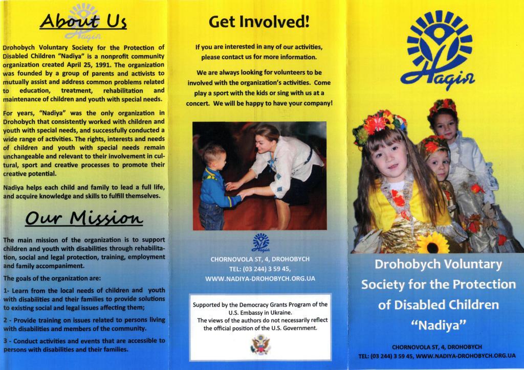 Вже чверть століття у Дрогобичі діє Добровільне товариство захисту дітей-інвалідів «Надія». За цей час змінювалися керівники «Надії», відходили одні учасники і додавалися інші, змінювалися форми та методи роботи. Але основна ціль «Надії» залишалася незмінною – всестороння реабілітація дітей. Адже батьки надіються, що все-таки буде реалізований ресурс їхньої дитини, нехай і неповносправної, з різними проблемами, та все ж рідної, бажаної, любимої.
