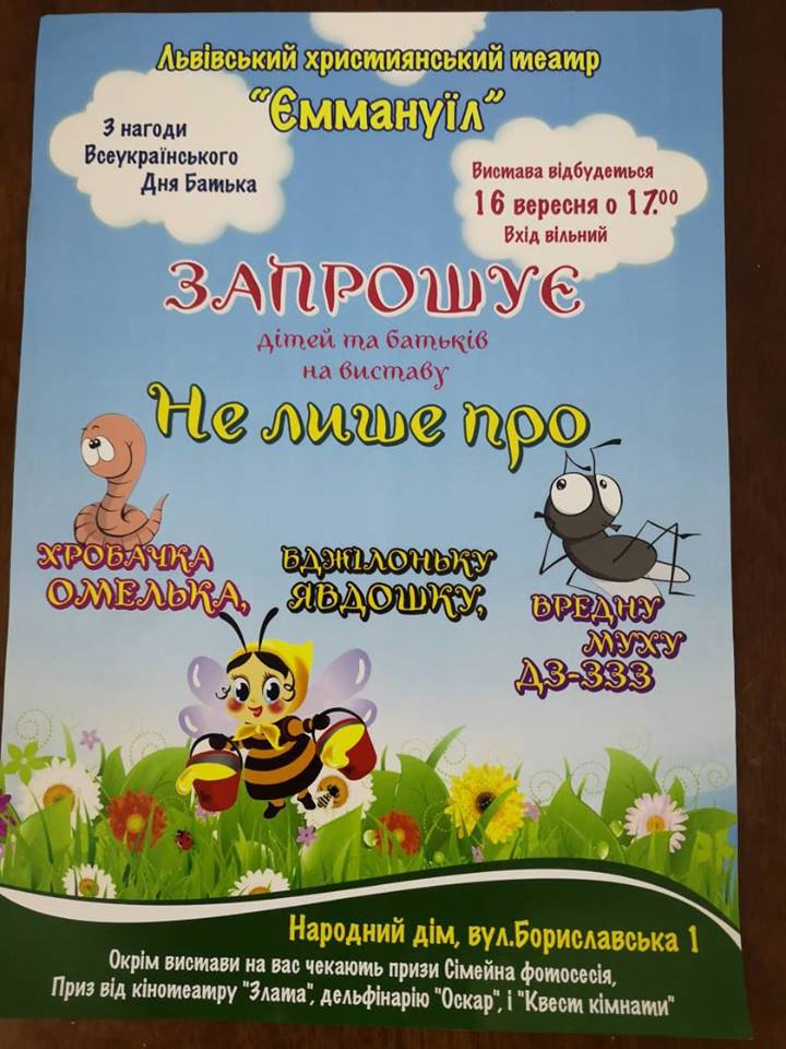 В неділю, 16 вересня, в рамках традиційного відзначення Всеукраїнського Дня батька, до Трускавця завітає Львівський християнський театр “Еммануїл”. Святкування відбудеться в Народному домі. Окрім святкової вистави, на гостей чекатимуть цікаві розіграші. Початок о 17.00. Вхід вільний.