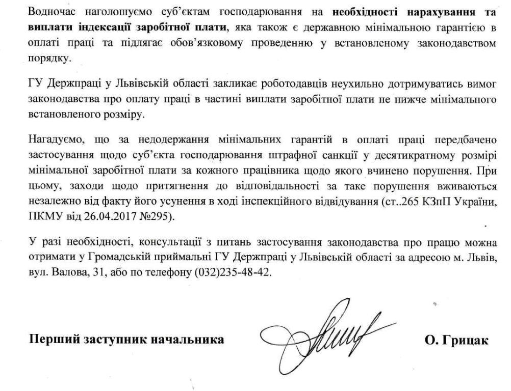 Водночас наголошуємо суб’єктам господарювання на необхідності нарахування та виплати індексації заробітної плати, яка також є державною мінімальною гарантією в оплаті праці та підлягає обов’язковому проведенню у встановленому законодавством порядку.