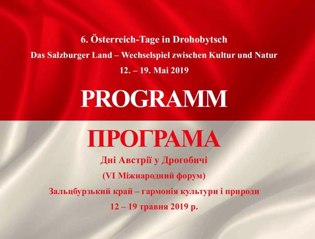 12-19 травня відбудуться чергові Дні Австрії в Дрогобичі – у форматі Міжнародного форуму «Зальцбурзький край – гармонія культури і природи». Про це повідомляють організатори події. На форумі відбудеться багато заходів, зокрема і в Трускавці, де проживатимуть учасники Днів Австрії. Так, зокрема, 12 травня (неділя) гості з Австрії приїжджають до Трускавця та поселяються в ряді готелів міста, а у вівторок, 14 травня, в ресторані «Сас» пройдуть літературні читання з переможцем літературного конкурсу серед зальцбурзьких авторів. Абсолютна більшість заходів пройде в Дрогобичі, програма розміщена на офіційному сайті Дрогобицької міської ради: https://drohobych-rada.gov.ua/dni-avstriyi-u-drogobychi-mizhnarodnyj-festyval-yakyj-prezentuye-drogobych-yevropejskij-publitsi/