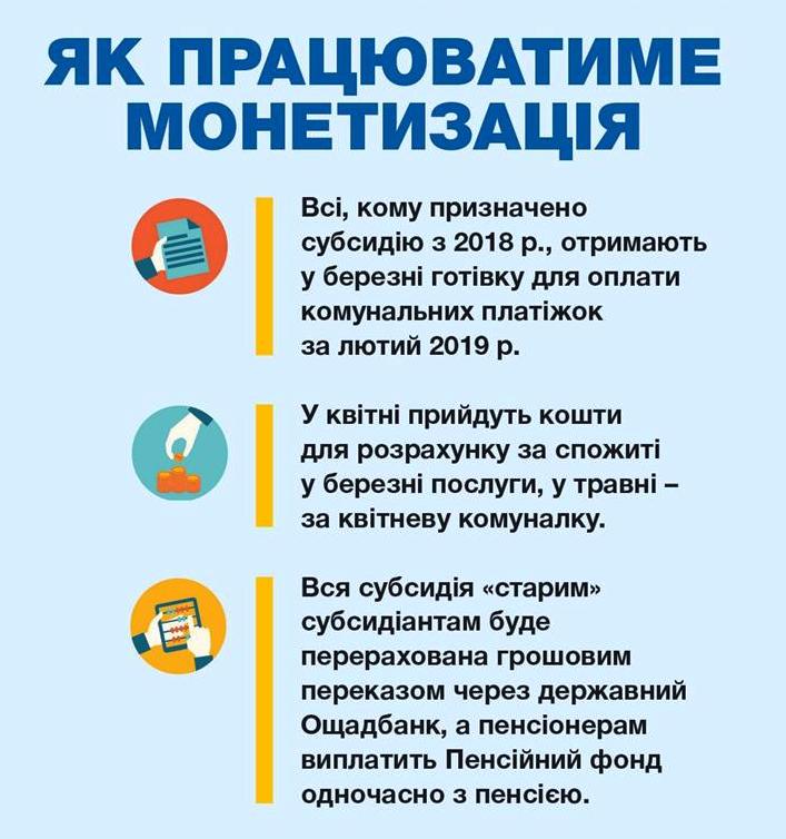 Паралельно діятиме запущена з січня 2019 року монетизація, яка передбачає розрахунки за спожиті послуги субсидіантами через Ощадбанк, і за результатами вже цього опалювального сезону виплату невикористаних субсидій одержувачам готівкою.