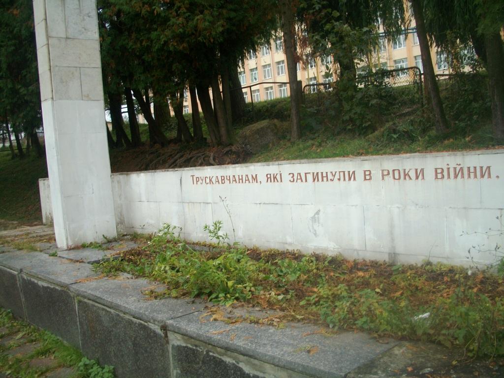 Їм належиться слава і шана від нас. Про живих – подбати, про померлих – також. Хіба так важко привести до ладу обеліск, на якому викарбувані прості слова «Трускавчанам, які загинули в роки війни»? Не пасує, щоб при самісінькому в`їзді в Трускавець була така неприбрана територія…