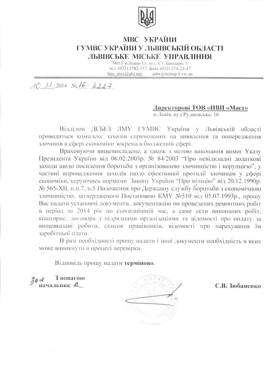На підставі відверто замовної та неправдивої скарги однієї з громадських організацій за дорученням генпрокуратури львівські правоохоронці розпочали слідчі дії на цій фірмі. В КПЛ викликає подив той факт, що у своїй скарзі так званий громадський активіст пан Шпікула, звинувачує ТОВ «Маст» в участі в корупційних схемах.