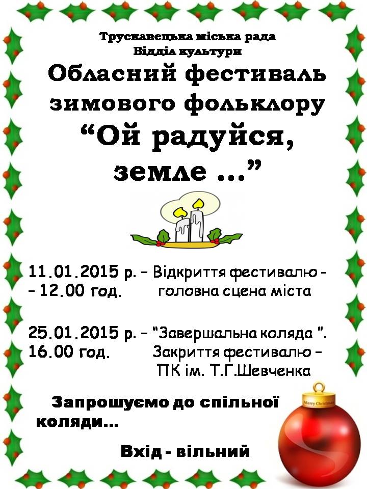 Відділ культури ТМР запрошує трускавчани та гостей міста долучитися до спільної коляди та взяти участь у фестивалі «Ой радуйся, земле …».