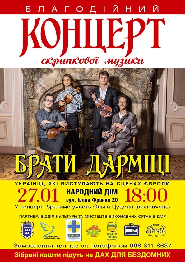 У суботу, 27 січня, в Народному домі Дрогобича (вул. І. Франка, 20) відбудеться благодійний концерт скрипкової музики братів Дарміців за участі віолончелістки Ольги Цуцман. Зібрані під час концерту кошти підуть на дах для бездомних. Замовлення квитків за тел. 098-311-86-37. Початок концерту о 18.00.