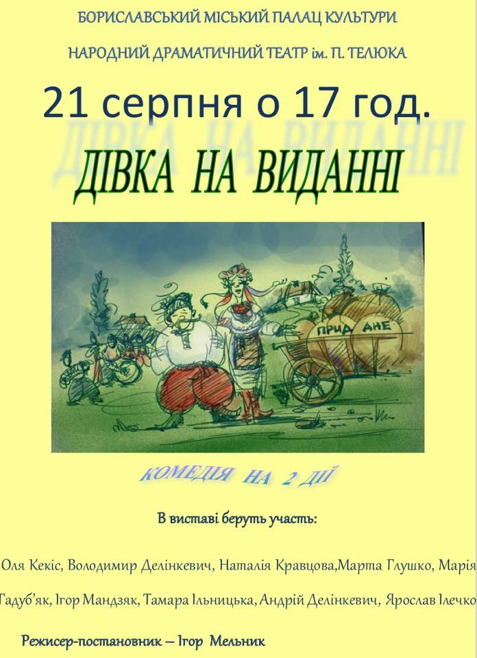 Бориславський міський Палац культури та Народний драматичний театр імені Петра Телюка запрошують на виставу «Дівка на виданні» (комедія на дві дії, режисер-постановник Ігор Мельник), яка пройде у неділю, 21 серпня, о 17.00. Вхід – вільний.