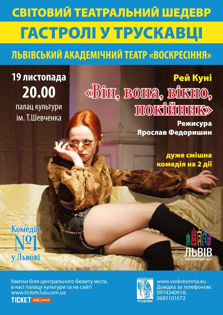 У неділю, 19 листопада, в Палаці культури ім. Т. Шевченка Львівський академічний театр Воскресіння покаже комедію «Він, вона, вікно, покійник» за твором Рея Куні (режисер Ярослав Федоришин). Про це інформує прес-служба Трускавецької міської ради.