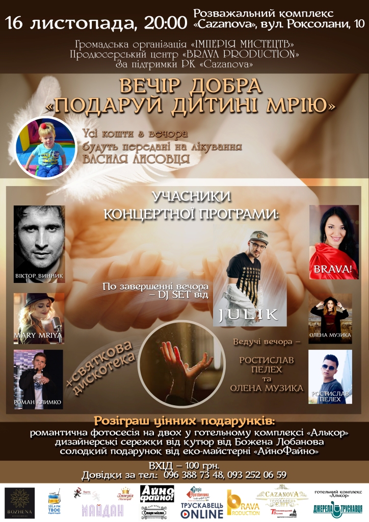 У п’ятницю, 16 листопада, о 20.00 у Розважальному комплексі «Cazanova» (м. Трускавець) відбудеться Вечір добра «Подаруй дитині мрію». Усі кошти з вечора будуть передані на лікування хворого хлопчика Василя Лисовця.