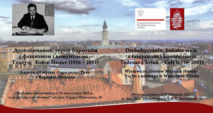 У Дрогобичі з 30 листопада у музеї “Дрогобичина” (вул.Т.Шевченка,38) розпочнеться виставка “Дрогобичанин, герой боротьби з фашизмом і комунізмом – Тадеуш Хцюк-Цельт (1916-2001)”. Будуть представлені речі із колекції варшавського музею “Народного Руху”. Пройде виставка у Дрогобичі під патронатом Генерального консульства Республіки Польща у Львові.