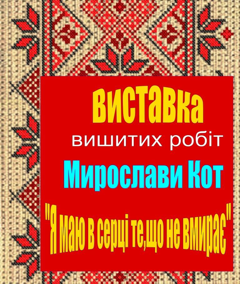 Художній музей Михайла Біласа (м. Трускавець) запрошує на відкриття виставки вишитих робіт Мирослави Кот “Я маю в серці те, що не вмирає”. Мисткині немає серед нас уже два роки, та її творчість надихає і вкотре заставляє впевнитися у талановитості української жінки і невмирущості наших традицій. Відкриття виставки пройде у вівторок, 11 квітня, о 16.00.