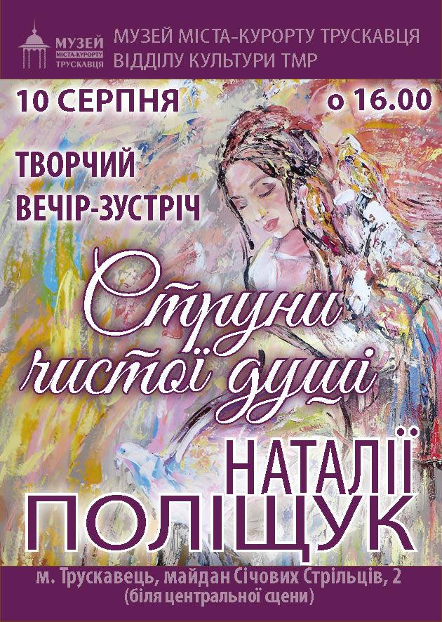 У п’ятницю, 10 серпня, в музеї історії міста-курорту Трускавець (вул. Січових Стрільців, 2) відбудеться творчий вечір з художницею Наталією Поліщук. Трускавецька мисткиня, художниця і поетеса Наталія Поліщук – донька славнозвісного трускавецького митця Юрія Копчака. Її персональна виставка «Con anima» минулого року вже експонувалася у Трускавці (в Художньому музеї Михайла Біласа), проте зустріч з талановитою землячкою-мисткинею не може бути зайвою. Тим більше, що на творчому вечорі Наталії Поліщук буде нагода не лише ознайомитися з її полотнами, але й почути вірші, автором яких вона є.