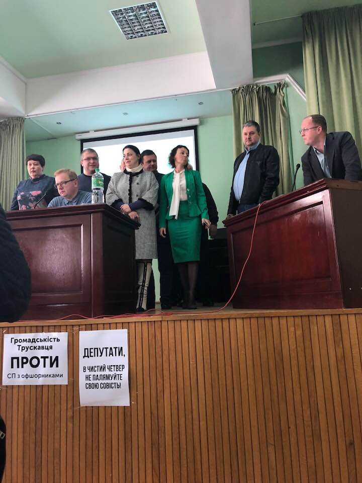 На сцену Народного дому, де проходила скликана у Чистий четвер позачергова сесія Трускавецької міської ради з одним питанням порядку денного, вийшов депутат Львівської обласної ради від Трускавця Олексій Балицький. Порушуючи регламент, не будучи головою пленарного засідання він закликав всіх депутатів і мешканців міста, які підтримують входження міської ради у сумнівну структуру, вийти на сцену, показавши свою підтримку і депутатам проголосувати. На сцену не вийшов жодний мешканець, окрім депутатів, які підтримали мера. Серед них юристи, які найкраще від інших знають, що спішно порушується встановлений законодавством порядок вступу до таких підприємств, не враховується думка Трускавецької громади, яка виступила проти незрозумілої співпраці з недобросовісним партнером, який занапастив Трускавець, багаторазово порушував договори з міською радою.