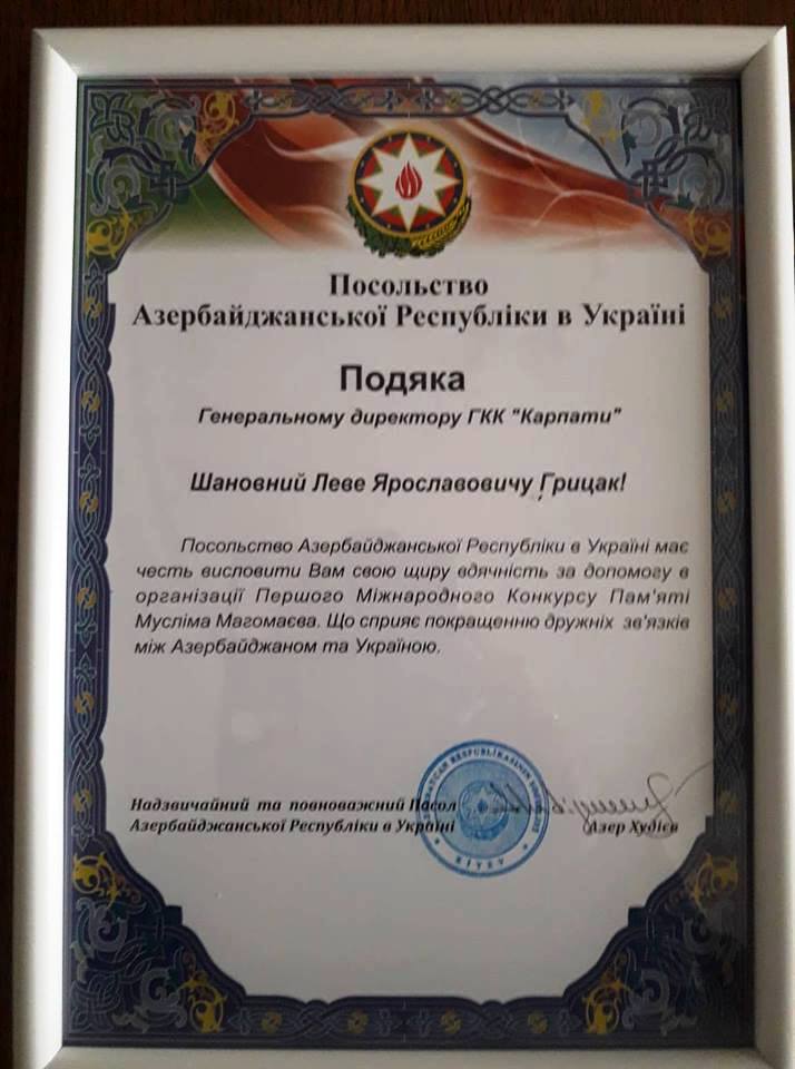 До речі, подяка від Міжнародної федерації хортингу – не єдина цього тижня для Лева Грицака. Паралельно з Чемпіонатом Європи з хортингу у Трускавці в ті ж дні (15-18 листопада) відбувався Міжнародний конкурс вокалістів «Пам`яті Мусліма Магомаєва», серед спонсорів якого були також ГКК «Карпати» та арт-ресторан «Я і Ти». Організатори конкурсу, Трускавецька міська рада в особі міського голови Андрія Кульчинського та Азербайджанський культурний центр імені Мусліма Магомаєва в особі його очільника, Народного артиста України Гурбаналі Аббасова також подякували ГКК «Карпати» та Левові Грицаку за підтримку Міжнародного конкурсу вокалістів.