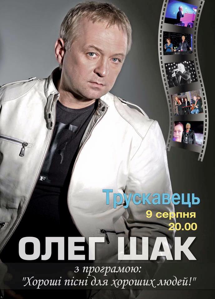 У Трускавці з концертною програмою «Хороші пісні для хороших людей» виступить Заслужений артист України Олег Шак. Як інформує співак на своїй сторінці в мережі Фейсбук, концерти у Трускавці пройдуть 8-10 серпня.