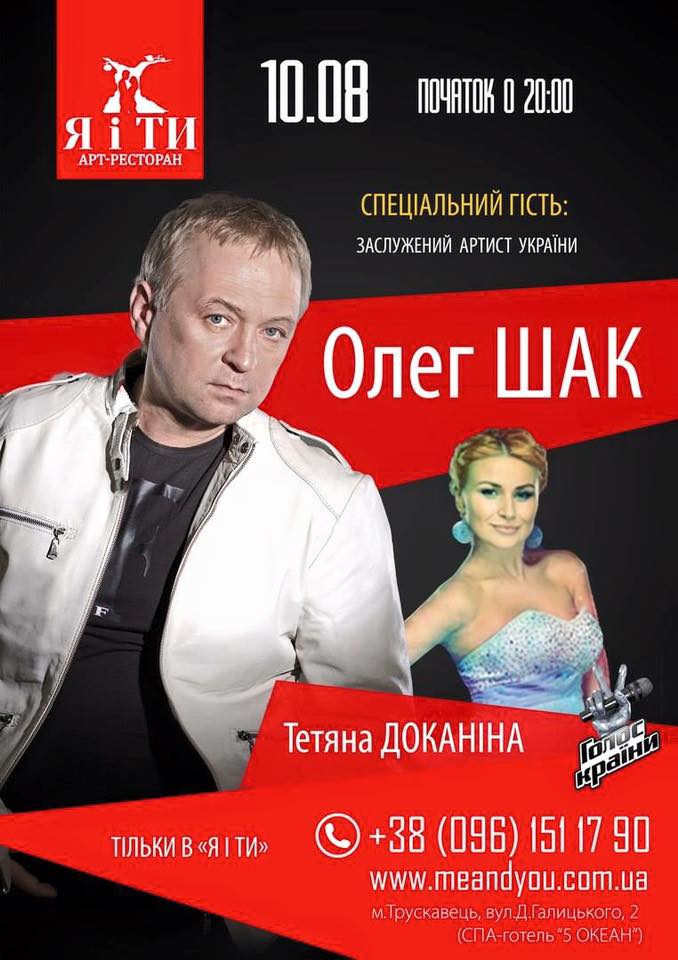 У понеділок, 8 серпня, Олег Шак співатиме в концертному залі Трускавецького готельно-курортного комплексу «Карпати» (поч. о 19.30), а у вівторок, 9 серпня – на сцені ПК ім. Т. Шевченка (поч. о 20.00). Натомість у середу, 10 серпня, Заслужений артист України Олег Шак буде спеціальним гостем арт-ресторану «Я і Ти» (м. Трускавець, вул. Д. Галицького, 2).