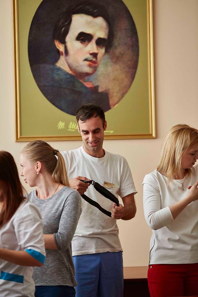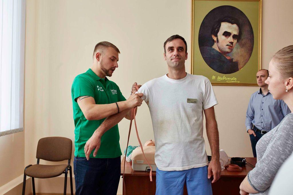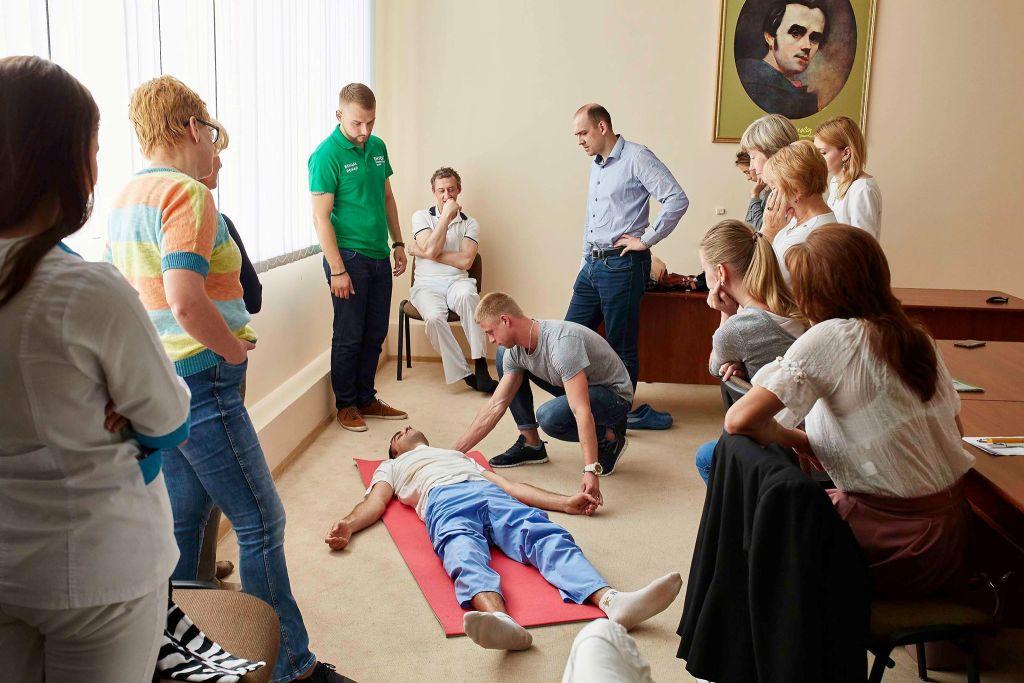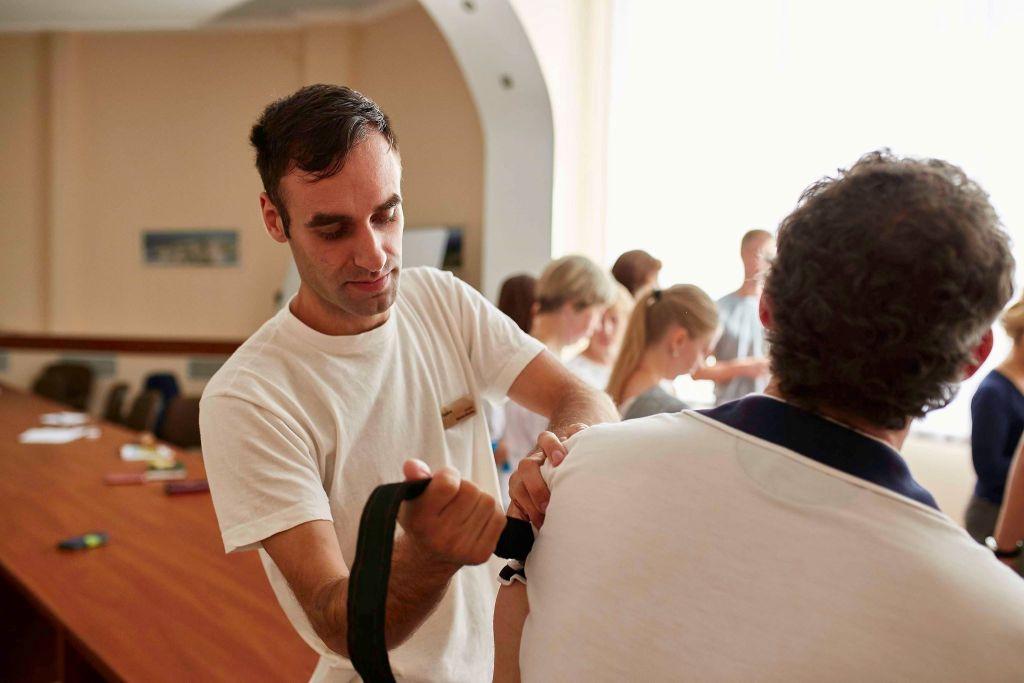 Заняття з невідкладної допомоги складаються з двох частин – теоретичної та практичної. На першій – аналіз випадків із життя, перегляд відео та слайдів, розповіді як діяти в конкретній життєвій ситуації. На другій – моделювання цих реальних ситуацій. Приступ епілепсії, кровотеча, теракт, виявлення непритомної людини, допомога утопленику чи постраждалому в ДТП – кожен приклад ілюструється конкретними діями, які проробляються на живій людині. Накладання джгута, перевірка прохідності верхніх дихальних шляхів, закритий масаж серця, допомога при ураженні електричним струмом – все це дуже добре після … тверезої та адекватної оцінки ситуації. Паніка – ворог хорошого рятувальника. Нехай весь світ панікує, а ми повинні швидко визначити що сталося, за яким алгоритмом діяти і … чи немає небезпеки нам самим. Адже хороший медик/рятувальник – це живий медик/рятувальник.