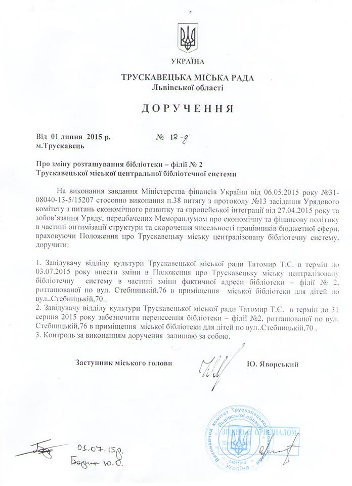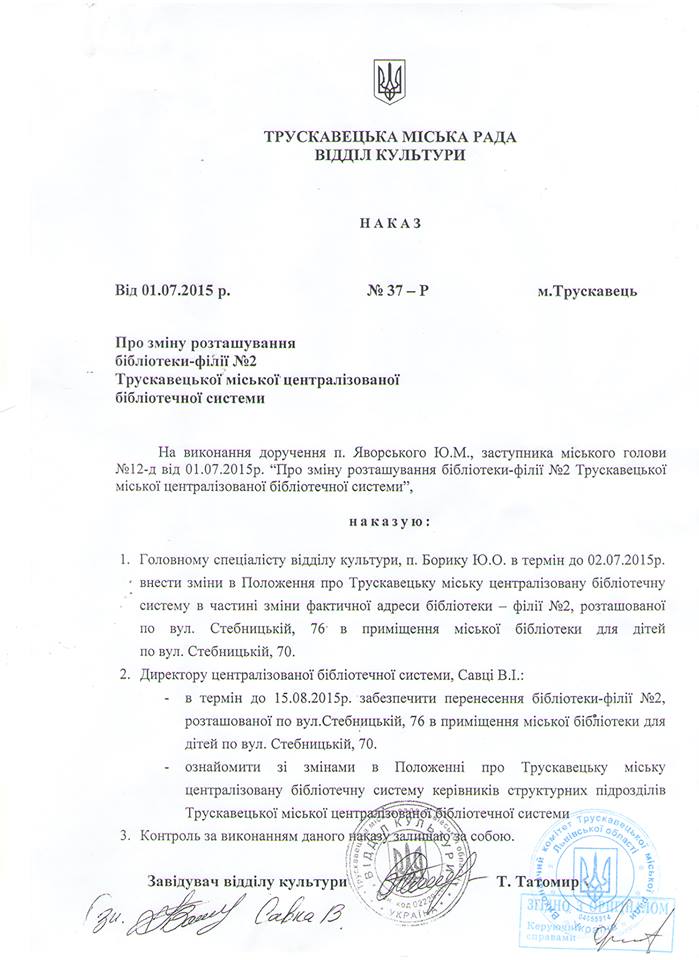 Місцеві ЗМІ неодноразово піднімали питання МЦБ. Нагадаю, 1 липня поточного року заступник міського голови Юрій Яворський дав доручення відділу культури Трускавецької міської ради про забезпечення перенесення бібліотеки філії № 2, розташованої по вул. Стебницькій, 76 в приміщення міської бібліотеки для дітей по вул. Стебницькій ,70, терміном – до 15 серпня.