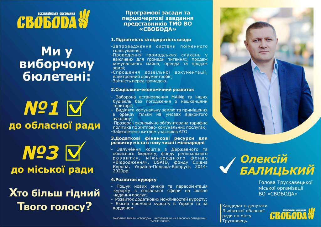 Ми продовжуємо розмову з Олексієм Балицьким, кандидатом в депутати Львівської обласної ради від Трускавця та першим кандидатом у списку Всеукраїнського об`єднання «Свобода» до Трускавецької міської ради.