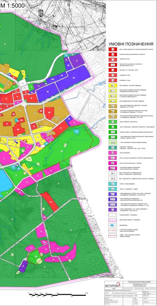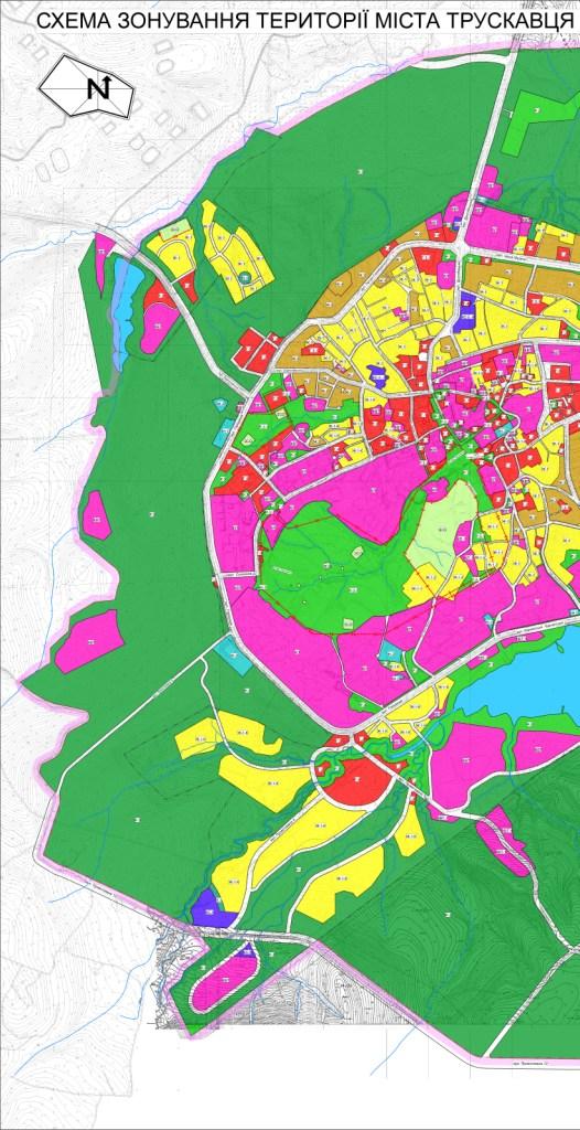 1. Згідно затвердженого генплану Трускавця у місті-курорті були визначені і затверджені наступні зони: 1) курортна зона, в яку входили санаторно-курортна зона, загальнокурортний центр та парк; 2) сельбищна зона, в яку входили 12 житлових кварталів; 3) комунально-складська зона, в яку входили склади, гаражі, котельні, автостоянки; 4) зелена ландшафтно-рекреаційна зона, в яку входили парки і лісопарки.
