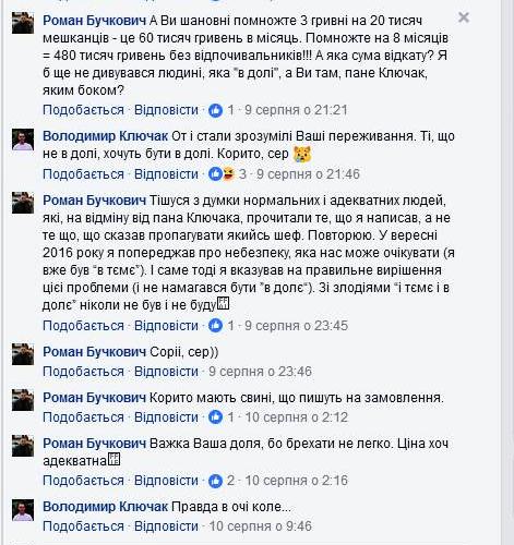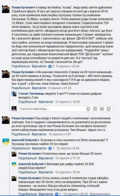 P.S. При підготовці статті використано цитати з коментарів депутата Трускавецької міської ради Романа Бучковича в групі «Міська рада Трускавець» в соціальній мережі Фейсбук за період з 9 по 15 серпня 2017 р.