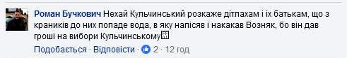 І вже в жодні рамки не влізає інше висловлювання пана Бучковича: «Нехай Кульчинський розкаже дітлахам і їх батькам, що з краників до них попаде вода, в яку напісяв і накакав Возняк, бо він дав гроші на вибори Кульчинському». Тут, як кажуть, без коментарів. Цікаво лише, що ж то за Возняк, який «напісяв і накакав» у воду, яка потрапить до дітей «з краників».