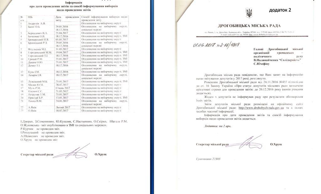 Рішенням сесії міської ради № 455 від 24.11. 2016р. визначено орієнтовний графік проведення звітів депутатів до 20.12.2016р., а після їх проведення про результати обговорення, зауваження і пропозиції, висловлені на адресу ради та її органів депутати мали інформувати відділ діяльності ради. Відповідно до офіційної інформації секретаря міської ради дане рішення ради депутати практично ігнорували. А наведена інформація щодо проведення звітів в більшості випадків не відповідає дійсності. Зважаючи на таку зневагу до норми закону про проведення звітів перед виборцями та надто абстрактне трактування її міським головою та депутатами щодо форми, методів та змісту звітів, ми розробили та запропонували для розгляду і затвердження Положення про звіт міського голови та депутатів міської ради. Даний проект Положення скерували для ознайомлення і розгляду міському голові, секретарю ради і голові регламентної комісії (представнику політичної партії «Самопоміч»). Два останні зовсім не відреагували на наше звернення. А міський голова в своїй відповіді процитував статті Законів України «Про місцеве самоврядування в Україні» та «Про статус депутата місцевих рад» щодо звітування. І зазначив, що на даний час не вбачає необхідності в затвердженні конкретних вимог до звіту, визначених в запропонованому Положенні.
